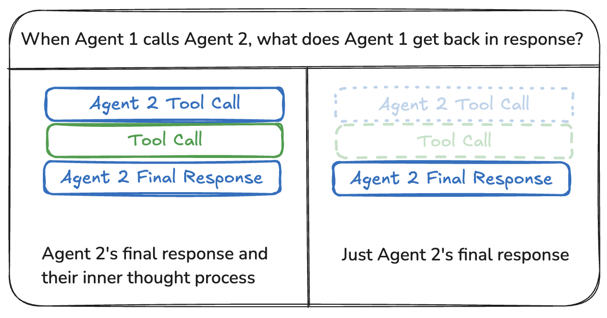 ). When communicating via a shared message list, there is an additional consideration: should the agents share the full history of their thought process or only the final result?